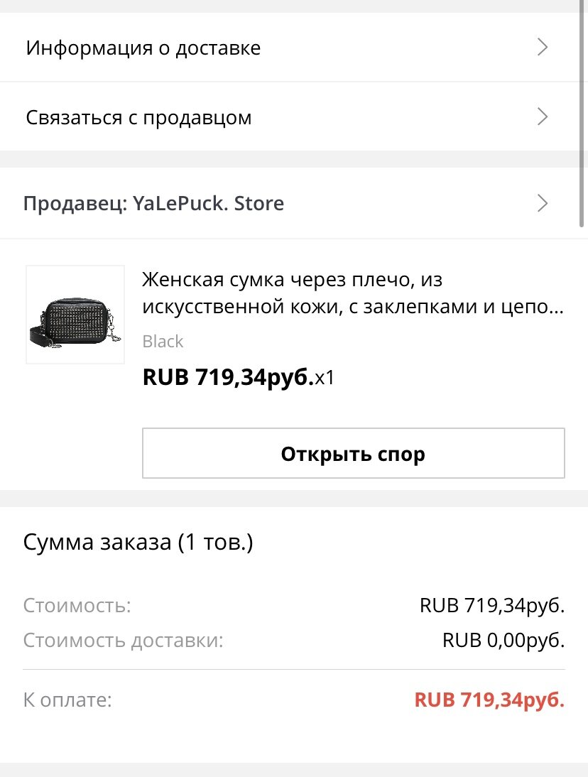 Всем большой привет, постоянные читатели и гости моего блога! Осень - довольно неоднозначное время года: это и красоты природы, во всём её золоте, бесчисленных оттенках багряного, и дожди, и непривычные холода после избаловавшего нас жарой лета. Зато, можно достать свои любимые тёплые вещи, обувь, и вкусить ощутимые перемены в разнообразии гардероба и ежедневных look-ов. Во всём видим плюсы. Сегодня речь пойдёт о сумках. Заказала я себе этот аксессуар на сайте AliExpress, если честно, увидела эту сумку у нас в одном магазине, и мне так она понравилась, по качеству, форме, исполнению, но было одно НО: она была в цвете хаки, который мне ни к чему не подходит и, в общем-то, сердцу не мил. Нашла 100% «клон» в классическом чёрном, и, конечно же, оформила покупку. Цена вопроса 719,34₽. Доставка бесплатная. В магазине, к слову, стоимость её была в два раза выше. О сроках доставки. 22.08.2022 заказ был оформлен, а 07.09.2022 посылка получена мною на Почте России (Нижегородская область). На мой
