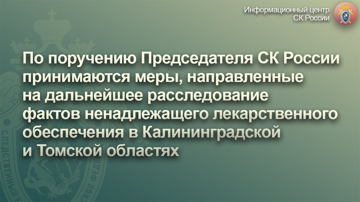 По поручению Председателя СК России принимаются меры, направленные на дальнейшее расследование фактов ненадлежащего лекарственного обеспечения в Калининградской и Томской областях Председатель Следственного комитета Российской Федерации Александр Иванович Бастрыкин на личном приеме граждан в июле 2022 года выслушал доводы жителей Калининградской и Томской областей. Заявители, которые являются родителями детей с тяжелыми заболеваниями, сообщили о том, что они не в полной мере получают положенные по закону медицинские препараты. Указанные сведения послужили поводом и основанием для принятия решения о возбуждении уголовных дел в отношении должностных лиц министерств здравоохранения указанных регионов по признакам преступления, предусмотренного ч. 1 ст. 293 УК РФ. Не предрешая заведомо виновность конкретных чиновников, в рамках предварительного следствия планировалось детально и объективно установить обстоятельства произошедшего в целях исключения рисков для жизни и здоровья граждан. Одн