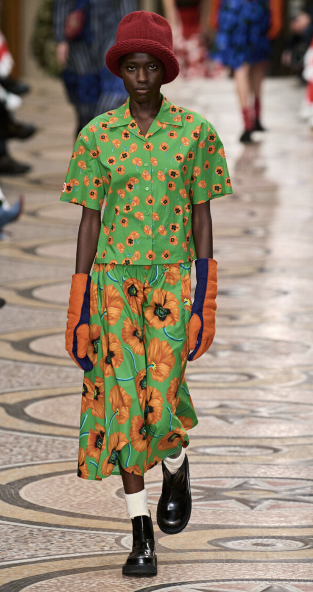 Начнём, с пожалуй, самого яркого цветового сочетания. Такаие оттенки сразу выдадут в вас модную штучку и к тому же добавят немало красок в ваш гардероб. На своём показе Kenzo не ограничились двумя яркими цветами, добавив к образу красную шапку (поправьте меня если знаете правильное название этого головного убора). А как вам перчатки?)
