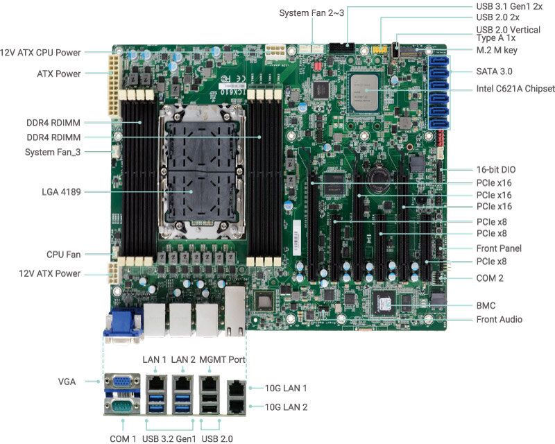 Компания DFI анонсировала материнскую плату ICX610-C621A на наборе системной логики Intel C621A. Новинка подходит для решения задач, связанных с машинным обучением, периферийными вычислениями, промышленной автоматизацией, медоборудованием и т.п. Допускается установка процессоров Xeon Scalable третьего поколения (Ice Lake-SP) в исполнении LGA 4189 (Socket P+) с показателем TDP до 205 Вт. Для модулей оперативной памяти DDR4-3200 RDIMM ECC доступны восемь слотов: объём ОЗУ может достигать 512 Гбайт. Накопители подключаются к шести портам SATA 3.0 с возможностью формирования массивов RAID 0/1/5/10. Есть также коннектор для твердотельного модуля M.2 2280 с интерфейсом SATA или PCIe 3.0 x4 (NVMe). Карты расширения могут быть установлены в три слота PCIe 4.0 x16 и два слота PCIe 4.0 x8. В оснащение входят сетевые контроллеры Intel I210AT и Intel X550-AT2, на базе которых реализованы соответственно по два порта 1GbE и 10GbE. Выделенный сетевой порт управления для BMC AST2500 построен на чипе R