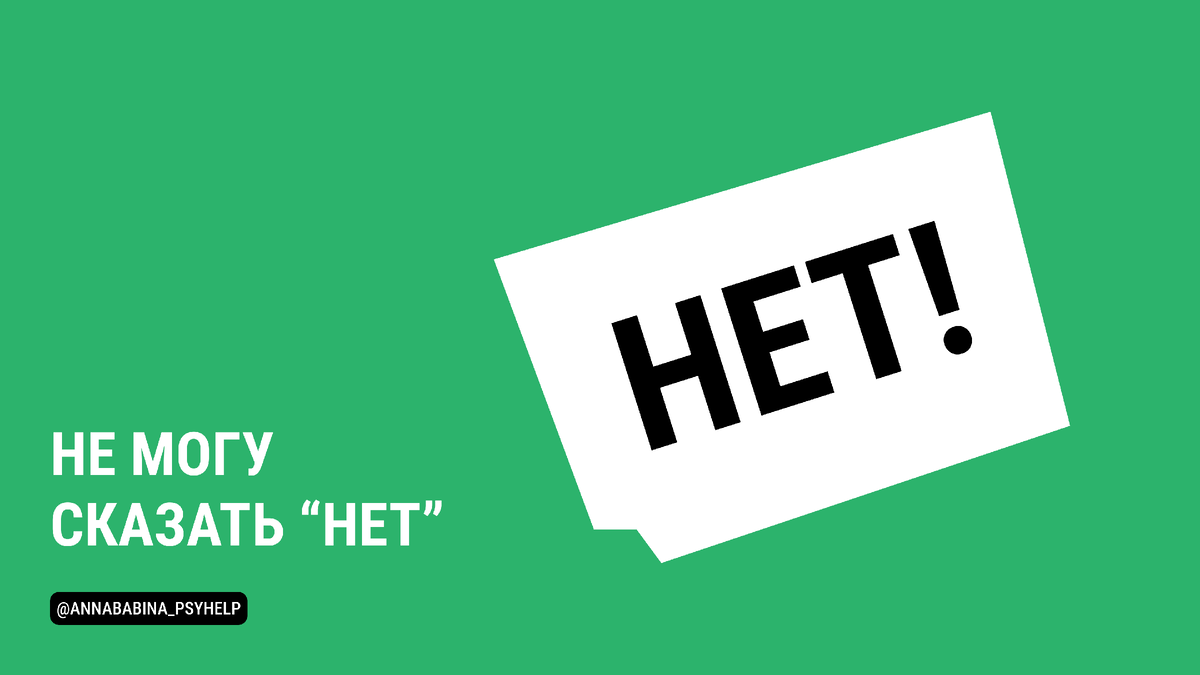 Думаю каждый бывал в ситуации, когда хотел сказать «нет»… но что-то пошло не так…и получилось «да», «конечно», «может быть» и т.д. Интересно, что в одной коммуникации человек может смело говорить «нет», к примеру, в рабочей, а вот в семейных отношениях сказать «нет» становится невозможным. К примеру отказать супругу в романтическом настроении или матери в просьбе с чем-то помочь. Трудность сказать «нет» может быть связана: Защитить свою границу и сказать «нет» для многих равна ссоре (что не обязательно). Ссора предполагает выражение злости. А злятся как известно только «плохие» мальчики и девочки. «Хорошие» уважают, помогают, любят, желательно вопреки своим интересам! «Если будешь отказываться есть, мама не будет с тобой играть». Если переводить с детского языка на взрослый, звучит это так: «До тех пор, пока ты не будешь вести себя как я хочу, я тебя не люблю, ты мне не нужен». Потеря любви для маленького ребенка ассоциирована с отвержением, а значит угрозой жизни. Стало быть, сказать