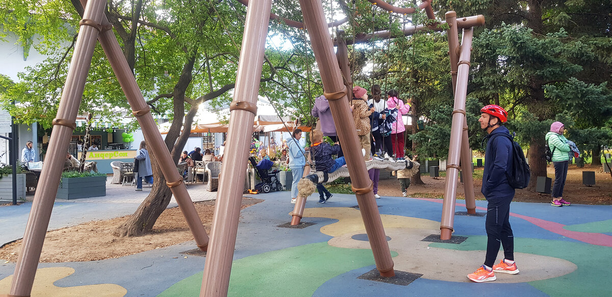 На ВДНХ всегда было туго с физическими активностями для детей. На весь парк всего две детские площадки: "Космос" и "Лукойл". В основном детям в парке предлагалось ходить на экспозиции или кататься по дорожкам на великах и самокатах. И вот к Дню города власти подготовили для детей несколько подарков: две новые детские площадки и самое высокое в Европе колесо обозрения "Солнце Москвы". Площадки хоть и простые, компактные, без единой тематики, но достаточно занимательные. Рядом стоит кафе "Андерсон", чьими удобствами всегда можно воспользоваться. Чуть поодаль возвышаются циклопические стрекозы, лабиринт для интровертов и одинокая карусель. Жаль, мало лавочек и аттракцион не самый интересный. Но самый ожидаемый аттракцион - "Солнце Москвы". Создатели не просто воткнули опоры посреди парка, а выстроили полноценный мини-город у подножия. В городском променаде предусмотрели кафе, парикмахерские, боулинг, бильярд, игровые, лабиринты, театрализованный Лисапарк, скамейки-качели... Своего рода па