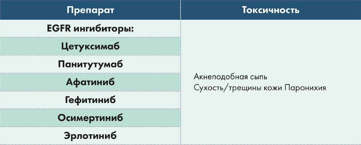 Таргетные лекарственные препараты – самая частая причина кожной токсичности у онкопациентов, она возникает в 90% случаев. Как правило, ее проявлением является акнеподобная сыпь. О том, какие препараты могут ее вызвать, какие можно принять меры по профилактике акнеподобной, как ухаживать за кожей во время высыпаний рассказывает Валентина Андреевна Загоруйко, врач-онколог, химиотерапевт НМИЦ онкологии им. Н.Н. Петрова. Акнеподобная сыпь - очень частое осложнение на фоне терапии EGFR-ингибиторами. Обычно сыпь возникает на коже лица, центральных участках груди и спины, волосистой части головы (что наиболее неприятно), в подмышечных областях и в промежности. Какие таргетные лекарственные препараты вызывают кожную токсичность В зависимости от степени поражения, сыпь может быть как мало распространенной, так и обильной – это осложнение лечения третьей степени. Профилактика возникновения акнеподобной сыпи Очень важный аспект – это защита кожи от солнца. Как защищать кожу от солнца с целью про