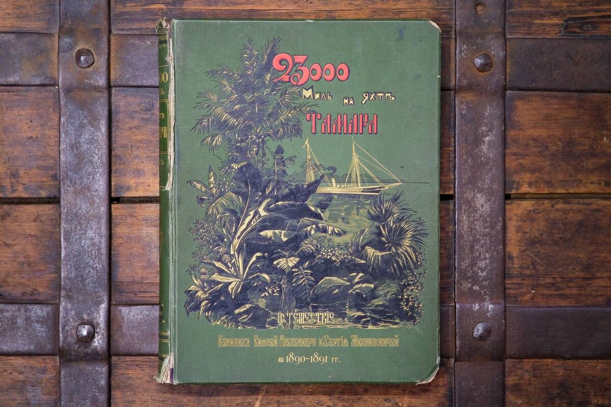 “23000 миль на яхте “Тамара”. Отправляясь в новое путешествие, мы ожидаем открыть для себя что-то новое и поставить мысленную “галочку” напротив заветного желания. Покорить новую вершину, побывать на море или прыгнуть с парашютом– только не говорите, что у вас нет такого списка! Вот и у царственных особ семьи Романовых наверняка тоже был подобный список. Давайте вместе посмотрим, что мечтали посетить внуки Николая I и с каким размахом они это делали! Очередным гостем мастерской стало издание 1893 года. Книга пришла к нам без значительных потерь для своего “возраста”. Помимо реставрации переплета была проведена механическая чистка страниц. Как вы можете заметить по фото, в нижних углах страниц остались темные пятна. К сожалению, такие следы бытования очень сложно вывести без химического вмешательства (к которому мы прибегаем в крайних случаях). Поэтому настоятельно рекомендуем во время чтения аккуратно перелистывать страницы и стараться не заламывать их– помимо затемнений могут появить