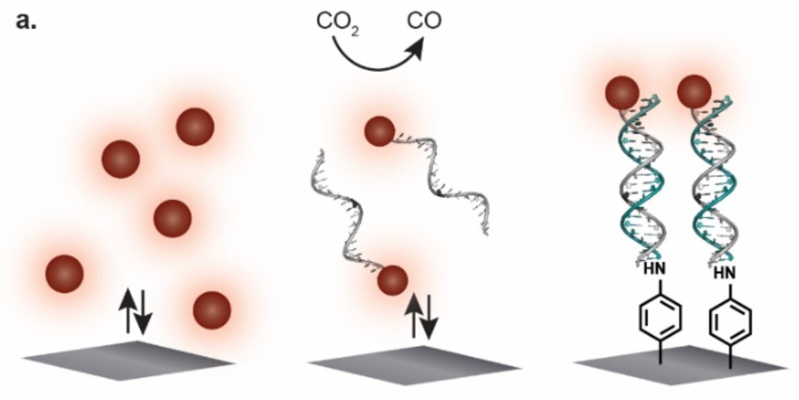 ДНК уже вовсю используют в качестве «внешней памяти». Даже уже появилась первая дезоксирибонуклеиновая сказка про страну Оз (да еще и на эсперанто). Теперь ученые научились с помощью ДНК перерабатывать углекислый газ — покрывать ею катализатор, улучшая его способности. Получившаяся система представляет собой своеобразный «союз газонокосилки и стеклореза», только в микромире. Сначала колдуны-ученые прикрепили к электроду одну нить ДНК. Это уже улучшило возможности катализатора разлагать СО2. Затем к катализатору, плавающему в водном растворе, добавили комплементарную цепь. С этого момента они стали связаны множественными водородными связями между спаренными основаниями. В результате катализатор прочно прикрепился к электроду. Такой модернизированный катализатор более эффективен для электрохимического разложения СО2. Кроме того, он стабилен и не деградирует при высоких напряжениях, необходимых для промышленной переработки углекислого газа. Ведь СО2 никогда не был непобедимым. Его мож