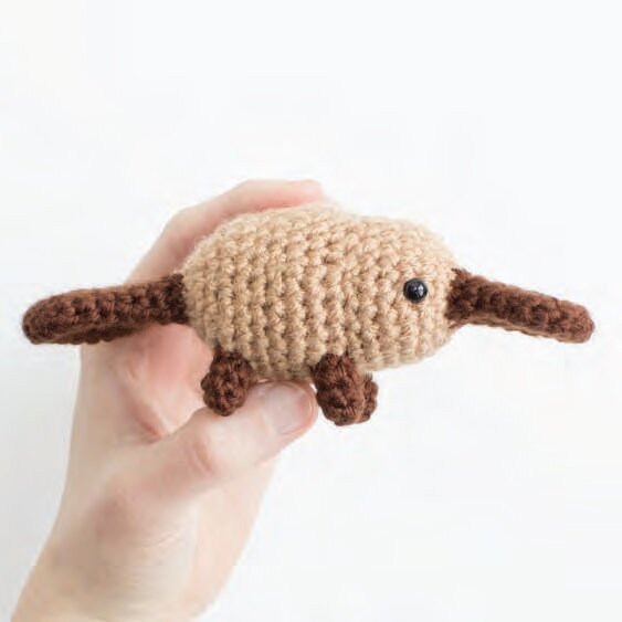 Пряжа - св. коричневая и т. коричневая Крючок по толщине пряжи Глазки, бусинки или бисер Черная нить с иглой для вышивания Наполнитель Игла для сшивания игрушек ТЕЛО: св. коричневая пряжа 1. 6 сбн в КА 2. 6 приб. (12) 3. "1 сбн, приб"х6 (18) 4. "2 сбн, приб"х6 (24) 5-7. 24 сбн Закрепить глазки между 4 и 5 рядами на расстоянии 12 сбн друг от друга, вложить наполнитель 8. "2 сбн, уб"х6 (18) 9. "2 сбн, приб"х6 (24) 10. "3 сбн, приб"х6 (30) 11. 30 сбн 12. "3 сбн, уб"х6 (24) 13.-15. 24 сбн Вложить наполнитель 16. "2 сбн, уб"х6 (18) 17. 18 сбн 18. "1 сбн, уб"х6 (12) 19. 6 уб Петли стянуть, нить закрепить, отрезать, спрятать кончик НОС: т. коричневая пряжа 1. 5 сбн в КА 2. 5 приб (10) 3. "1 сбн, приб"х5 (15) 4-5. 15 сбн 6. "1 сбн, уб"х5 (10) 7-8. 10 сбн Нить закрепить, оставить длинный конец для пришивания. На одной стороне носа вышить черной нитью два параллельных стежка-ноздри длиной в 2 ряда (между 3 и 5 рядами) на расстоянии 2 сбн между ними. Нос не набивать, сложить в плоскую деталь, при
