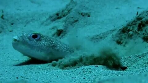 Это японский и иглобрюх и он очень старается и ведь если он остановиться его дейтище смоет тиченьем так вот старается для того чтобы привлечь внимание самки и вот что у него вышло