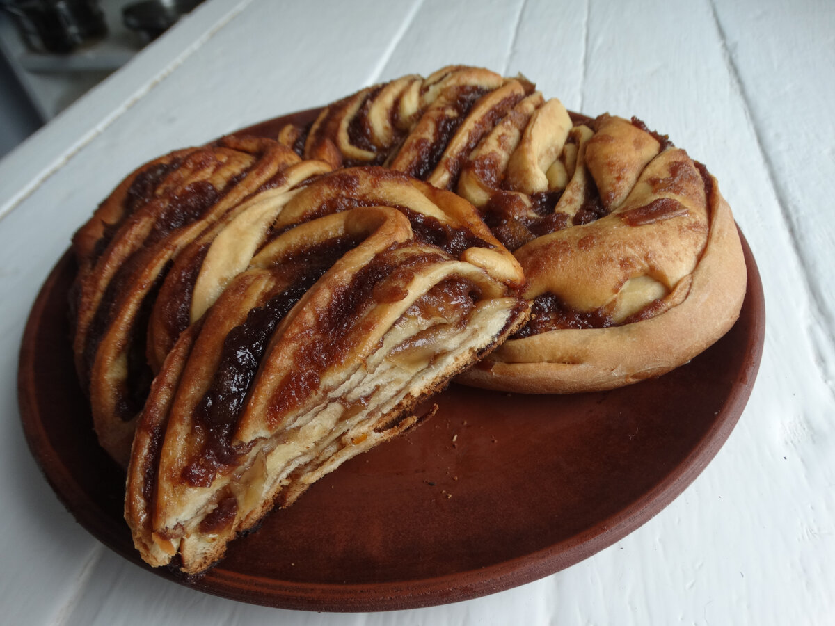Если делать яблочный кранц по моему рецепту, пирог получится нежнейшим, легче и пышнее, чем бисквит. А фруктовая прослойка больше будет похожа на крем. Так что такой кранц от торта не отличить. Вместо яблок можно взять любые другие фрукты: груши, сливы. Правда, груши придется чуть дольше готовить, чтобы сделать консистенцию грушевой начинки более плотной. Для того, чтобы в разрезе пирог выглядел более эффектно, я «окрасила» яблочную начинку порошком какао. Это придало пирогу более интересный вкус, но, главное, начинка стала отличаться по цвету от теста. Если же начинка яркая, например, приготовленная из слив, такую фруктовую массу можно не окрашивать. Кранц – это венок, поэтому, нужны хоть и минимальные, но усилия, чтобы сплести его из теста. Признаюсь, я еще до конца не осилила эту науку, чтобы венок получался идеальным. Но на вкус вид пирога не влияет, и это хорошо. Правда, я открою маленькую хитрость, как сделать кранц более привлекательным и пышным. Один момент! Я готовлю пирог из