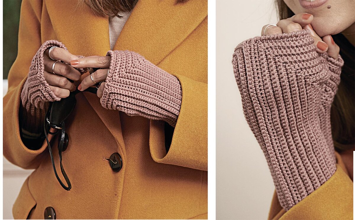 Стильные митенки с узором из столбиков прекрасно будут смотреться и с пальто,и с курткой, и с шубкой. Размер единый ВАМ ПОТРЕБУЕТСЯ Пряжа (100% мериносовой шерсти; 50 г/105 м) — 3 мотка пудрово-розовой, крючки № 3,5, 4 и 4,5. ПЛОТНОСТЬ ВЯЗАНИЯ 22 ст. б/н х 30 р. = 10 х 10 см, связано основным узором крючком № 4. ВАЖНО! чтобы получить изделие соотв. размера, плотность вашего вязания должна соответствовать заданной, особенно по ширине. Поэтому, прежде чем приступать к работе, следует связать образец узора: набрать 30 в. п. и вязать 14 см основным узором. Затем сосчитать петли на среднем участке изготовленного образца длиной 10 см: если на этом отрезке больше 22 петель, поменять крючок на более толстый, если меньше — на более тонкий. Если в инструкции указано только одно число, то оно относится ко всем размерам. ВНИМАНИЕ! Все детали вязать ст. б/н за заднюю стенку. ВЫПОЛНЕНИЕ РАБОТЫ ПЕРВАЯ ЧАСТЬ ДЕТАЛИ На крючок № 4,5 набрать 1 п. и выполнить цепочку из 72 в.п.