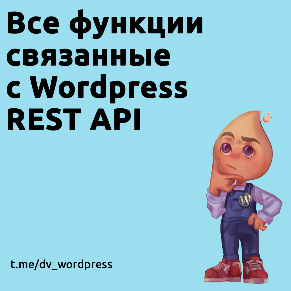 get_rest_url() - получает URL конечной точки REST API. Позволяет указать сайт сети. register_rest_field() - регистрирует новое REST поле для указанного типа REST объекта (ресурса). register_rest_route() - регистрирует маршрут REST API и его эндпоинты (конечные точки). Говоря проще регистрирует URL по которому будет срабатывать указанная PHP функция. rest_ensure_response() - проверяет и, если надо, преобразует переданные данные в объект класса WP_HTTP_Response. rest_is_boolean() - определяет, является ли переданное значение логическим или подобно логическому. Т.е. также как и PHP не учитывает тип значение: 1 - true, 0 - false. rest_output_link_wp_head() - выводит ссылку на корневой REST API маршрут в секции <head> на всех страницах сайта. rest_sanitize_array() - преобразовывает переданное значение в индексный массив. Если преобразование невозможно вернет пустой массив. rest_stabilize_value() - унифицирует (стандартизирует) переданное значение в соответствии с семантикой JSON схемы. rest