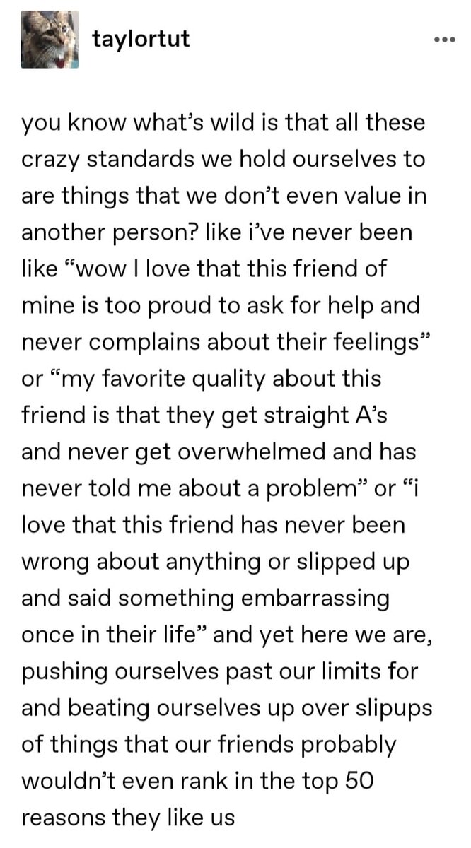 знаете, что удивительно: все сумасшедшие стандарты, к которым мы себя приучаем, - это то, что мы даже не ценим в другом человеке?например, я никогда не говорил_а: "мне нравится, что мой друг слишком горд, чтобы попросить о помощи, и никогда не жалуется" или "мне нравится в этом друге то, что он получает одни пятерки, никогда не устает и никогда не рассказывает мне о проблемах" или "мне нравится, что этот друг никогда не ошибался ни в чем, ни разу в жизни не оступился и не сказал что-то постыдное", и все же мы заставлям самих себя превышать свои пределы и ругаем себя за промахи в вещах, которые наши друзья, вероятно, даже не включили бы в 50 лучших причин, по которым мы им нравимся.