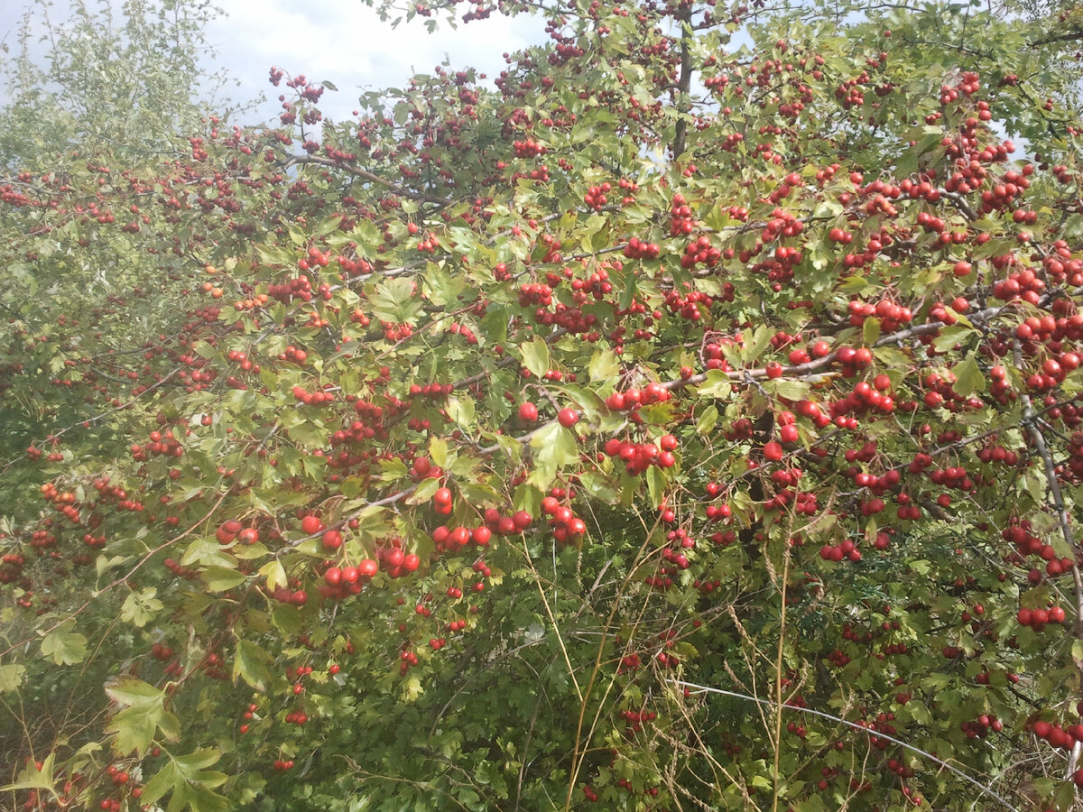 Погода всё-таки - за нас. В середине августа пошли дожди, после грандиозной засухи. Зелень, которая давно потеряла надежду, вдруг воспрянула духом. На поле, где мы гуляем с Кейси, сквозь сухие стебли вылезла новая трава. Мурка давно не ждала милостей от природы. Обычно приносили ей травку, кошка встречала в дверях, бежала скорее к плошке, хрумкала витамины. С июля разносолы исчезли. На поле торчала жёлтая стерня. Еле-еле зелёные травинки для кошки выбирали, но видимо слишком сухие. Мурочке не нравились. И последние недели опять настало изобилие. Не поверила животника счастью, когда впервые за месяц получила сочные дары. Неожиданно заново расцвёл зверобой и репешок. А боярышник сошёл с ума. Раньше вообще на поле не видели, случайно пару кустиков отыскали. В прошлые года откуда-то появился. Много, но ягодки меленькие, собирать муторно. С неделю назад наткнулись на странное зрелище - боярышник размером с вишню. Мутант, аномалия. Ничего не аномалия, сегодня ещё штук пять подобных наш