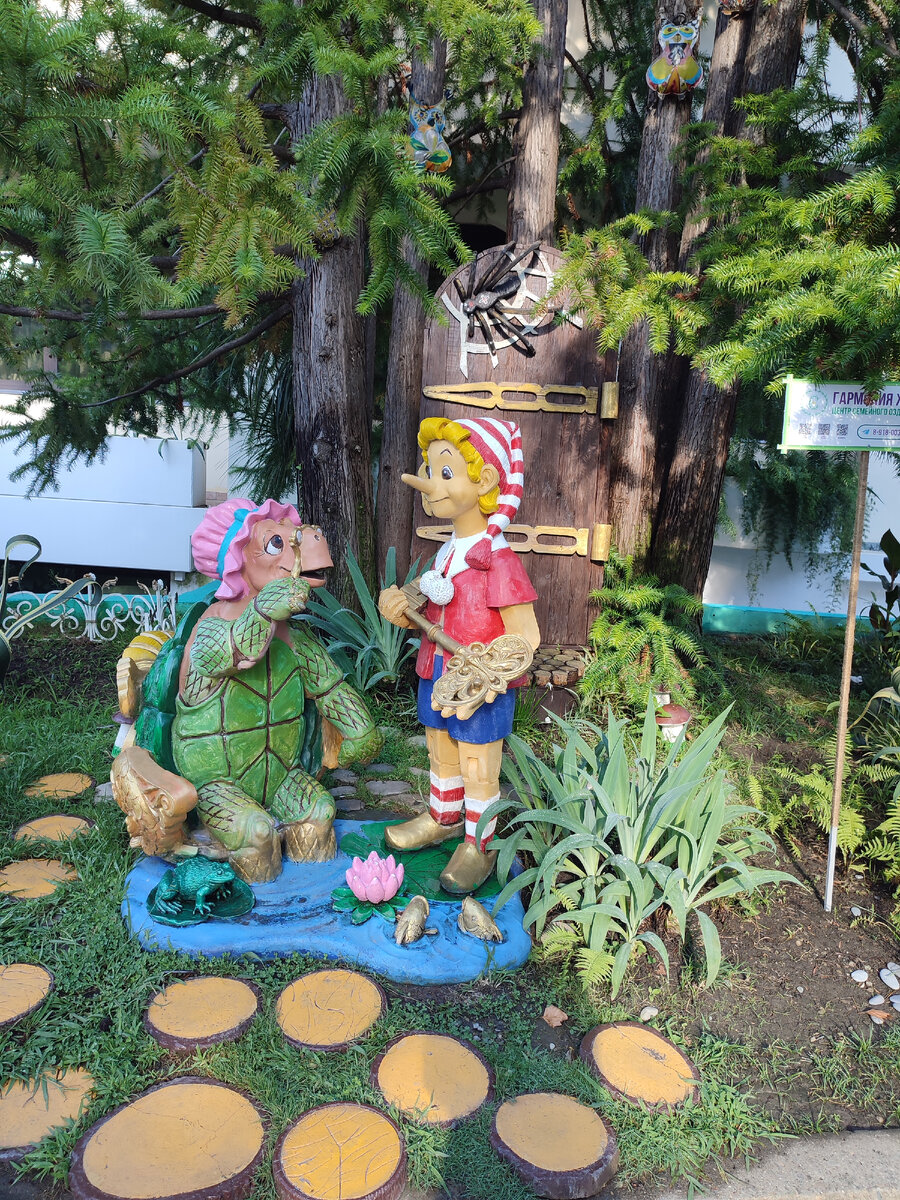 На следующее утро после прилёта, решили сходить в зоопарк санатория Октябрьский (ул. Плеханова, 34Б, микрорайон Мамайка). Это вроде как самый крупный зоопарк в Сочи. Ну а так как от нас он находится в 10 минутах пешком, то выбор был очевиден. Стоимость билета взрослые 500 руб, дети 250 руб, до 3 лет бесплатно. Зоопарк расположен на территории санатория, соответственно проход в него проходит через территорию оздоровительного учреждения. Поэтому не могу ни отметить, что всё ухожено, много локаций украшенных скульптурными композициями. До этого посещала зоопарк г. Новосибирска. На мой взгляд, животные в сочинском зоопарке выглядят счастливее и более ухоженно. Шерстка лоснится, упитанные, чистенькие. В клетках убрано, никакой вони. Отсутствие запахов меня очень удивило, так как когда помещали Новосибирский зоопарк запах от клеток семейств кошачьих стоял знатный, а тут вообще нет. Это приятно удивило. Так как были утром некоторые животные сладко спали, и дефилировать перед на