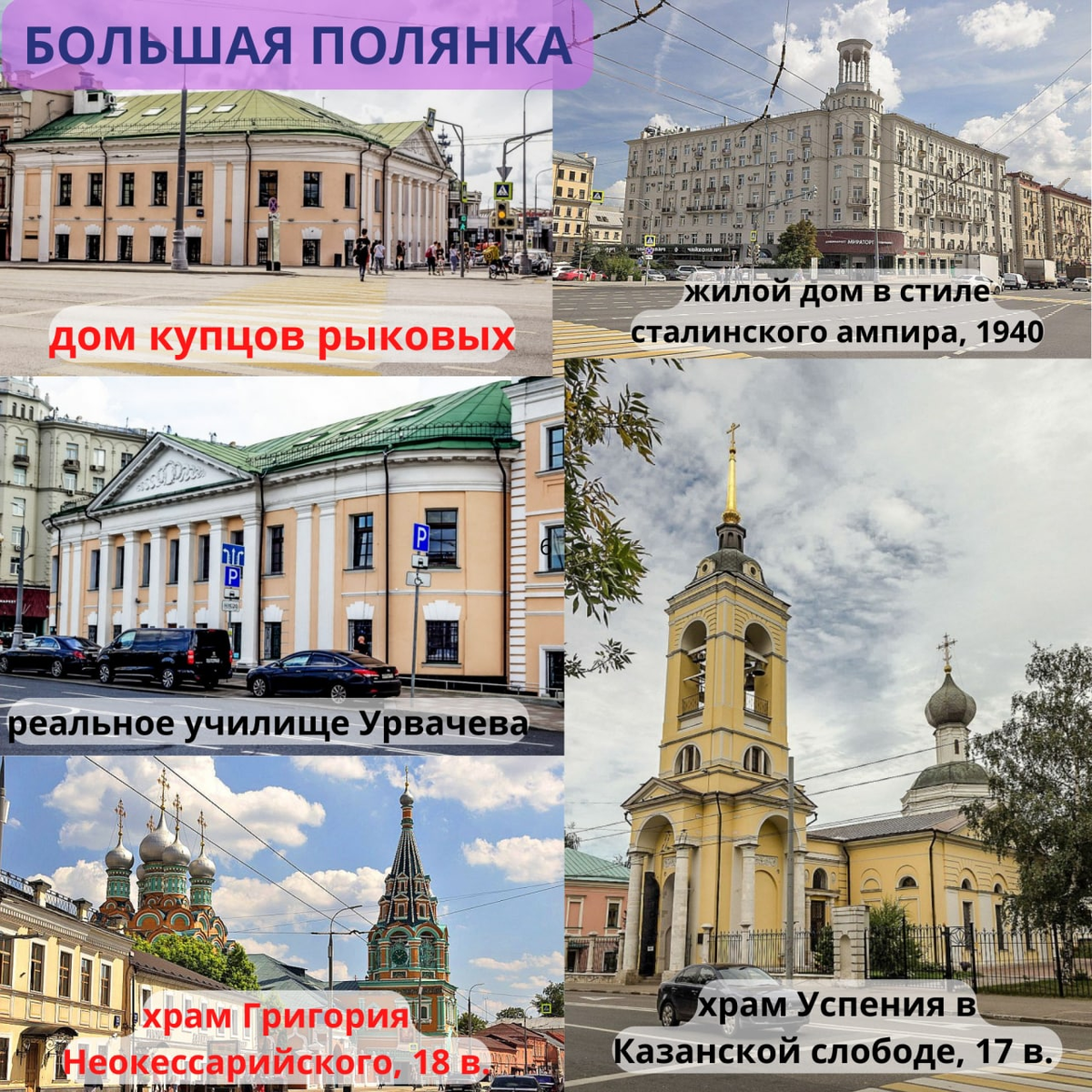 Улица Большая Полянка в Москве - очень старая и одна из самых уютных в Москве. Прямо от Кремлевских стен взору зрителя ранее и как сейчас представлялись купола церквей, расположенных на этой улице, и самое настоящее Замоскворечье. Днем, нельзя сказать, что здесь многолюдно. А ночью вообще, можно сказать - пустынно (хотя казалось бы - центр Москвы!). Наверное это также из самых эклектичных мест центра - потому что здесь есть и современные здания советского времени, и доходные дома, и старинные особняки. Можно найти и старорусские, и советские, и европейские черты. Начинаясь как улица, разместившая стрельцов, и затем ремесленная улица, со временем Большая Полянка превратилось в место обитания московской аристократии. Здесь располагался и монетный двор, и ткацкая слобода. Она приютила здания в стиле классицизма, московского барокко, неоготики, модерна, сталинского ампира. Здесь проходила и конно-железная дорога, а затем и трамвайная. Благодаря близости французского посольства, здесь в