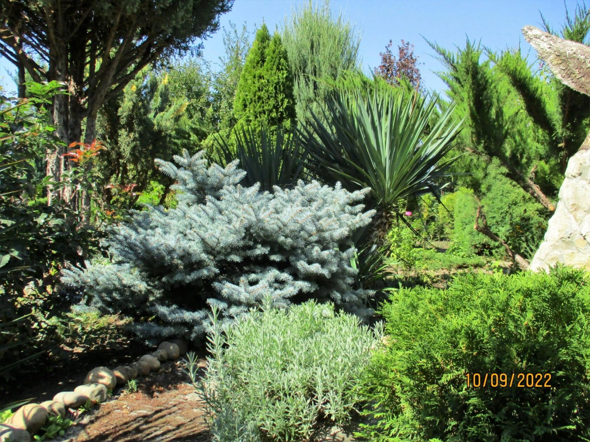 Каким был бы сад, если бы в нём не было хвойных? Серым и скучным, особенно в зимнее время. Скоро начнут желтеть листья на деревьях, это длится недолго , особенно в засушливую осень. Листья опадут и деревья станут голыми. Только хвойные и украшают сад в зимний период. Расскажу о некоторых хвойных, которые растут в саду. Напомню, что сад находится в Краснодарском крае, г. Тихорецк. Площадь сада 20 соток. В центре ель "Глаука Глобоза". Лаванда выросла самосевом прямо в щели на бетонной тропинке , которая идёт вокруг горки. На горке растёт туя "Даника". В центре на площадке у пруда растёт сербская ель. Обратная сторона иголочек у этой ели с белыми полосками. На ней уже выросли красивые шишки и два года висят. Казацкий можжевельник "Мас". В саду таких можжевельников много. Все стригу по- разному. У этого только немного укоротила ветки. За ним барбарис "Мария" и мискантус. Туи "Смарагд" и восточная. В бордюре около туй "Смарагд" растут казацкие можжевельники "Мас" . Их я в