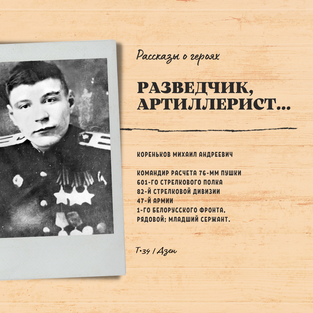 Первого «языка» сержант Михаил Кореньков записал на свой счет летом 1942 года. Правда, пришлось поспорить с командиром взвода, который предлагал пойти втроем да еще взять группу прикрытия. Но Кореньков убедил, что сподручнее действовать одному. По лощинке протекала небольшая речушка, скорее, ручей. Как-то около полуночи Кореньков засек там плеск и довольное покряхтывание, — похоже, немец снимал в ручье дневной жар. Вот и решил сержант наведаться на тот «пляж». Но напрасно сидел он в кустах по горло в воде: немец купаться не шел. Незаметно стало светать, и тут Кореньков увидел, что у него над головой, по кустам проходит провод. Кореньков вылез из ручья и, пригибаясь, а где и по-пластунски, последовал вдоль провода. Так он и двигался, зажав в руке финку, пока не кончился лозняк. Здесь разведчик уже точно определил, что это провод связи. Впереди показалась не большая поляна, и Кореньков остановился. На поляну выходить было рискованно, туман рассеялся, и Кореньков решил возвращаться. Но пр