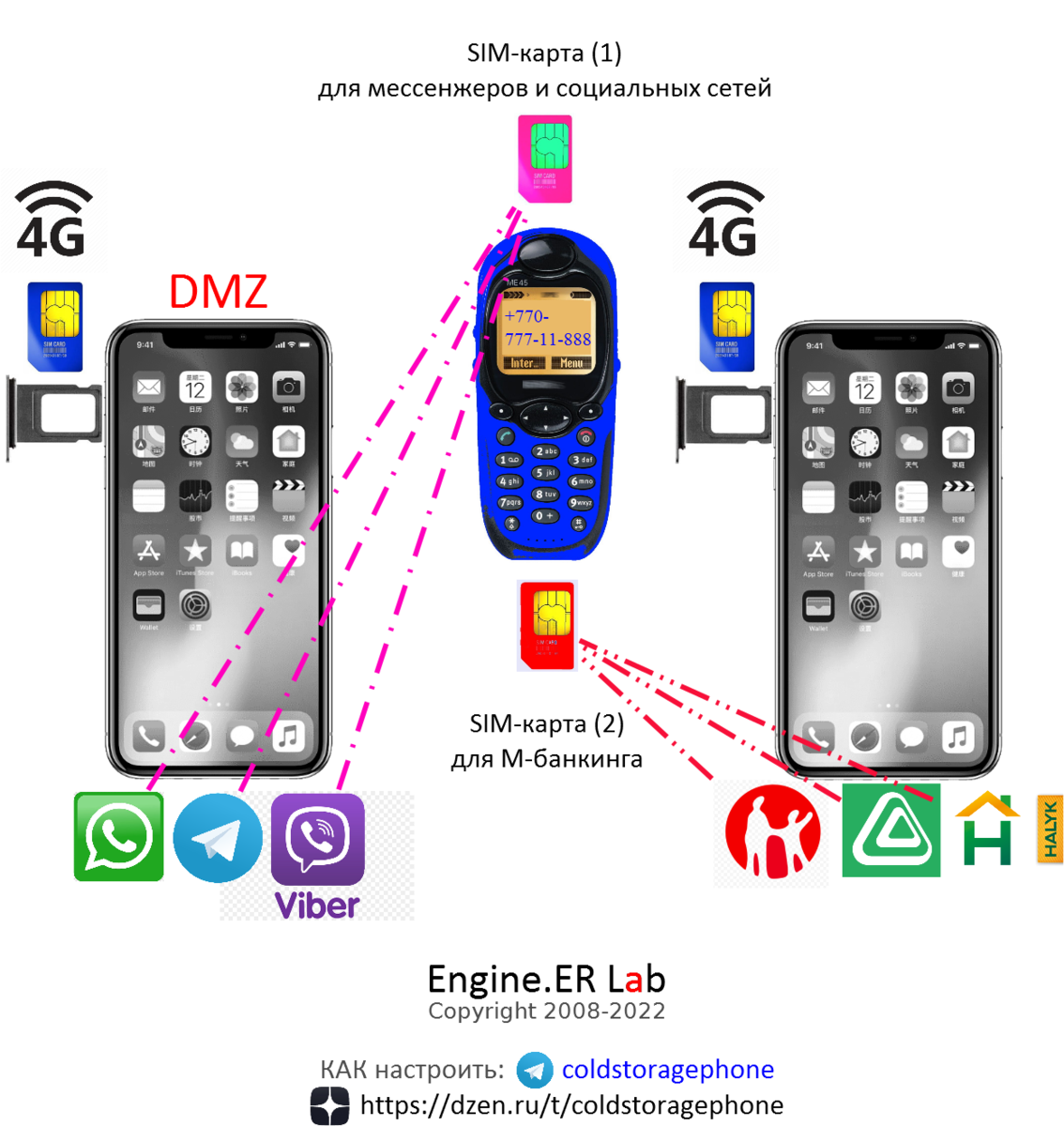 Если Вы используете два (2) смартфона, эта схема обеспечивает максимальную защиту Ваших банковских приложений. Теперь Ваш номер, который Вы используете для М-банкинга [SIM-карта(2)], можно узнать только с Вашего согласия. Узнать этот банковский номер по номеру Ваших мессенжеров и аккаунтов в соцсетях невозможно. В этой схеме первый_смартфон выполняет роль DMZ - мы установили на него все приложения, через которые хакеры обычно заражают смартфоны. Теперь компрометация (взлом) первого_смартфона не даёт хакерам доступа к Вашим банковским приложениям - все они установлены на втором_смартфоне. Эта схема снижает вероятность взлома второго_смартфона с банковскими приложениями. Основную защиту обеспечивает кнопочный телефон, который мы называем холодным_телефоном → #coldstoragephone. Он изолирует