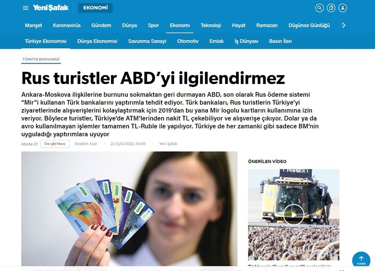 Буквально вчера США неофициально разослали всем Центробанкам государств, которые работают с картами российской платёжной системы "МИР" предупреждения о том, что на банки, которые обслуживают карты "МИР" могут и будут наложены санкции. Турецкие банки и газеты называют же это угрозами и шантажом: Некоторые страны сразу же в этот день отказались от использования карт "МИР". Это Казахстан и Вьетнам. Эрдоган же заявил 22 сентября, что 23 сентября (сегодня) проведёт совещание с министрами о возможности дальнейшего использования российских карт. Напомню, что Турция одна из тех стран, которая первая начала использовать карты "МИР". До сегодняшнего дня количество турецких банков, которые принимали карты "МИР" только росло. По картам можно было как платить в Турции, так и снимать деньги с банкоматов. В Турции проживает большое количество россиян (в частности тех, кто сбежал туда после начала СВО, а сейчас продолжают бежать после объявления мобилизации), отдыхает там и большое количество российск