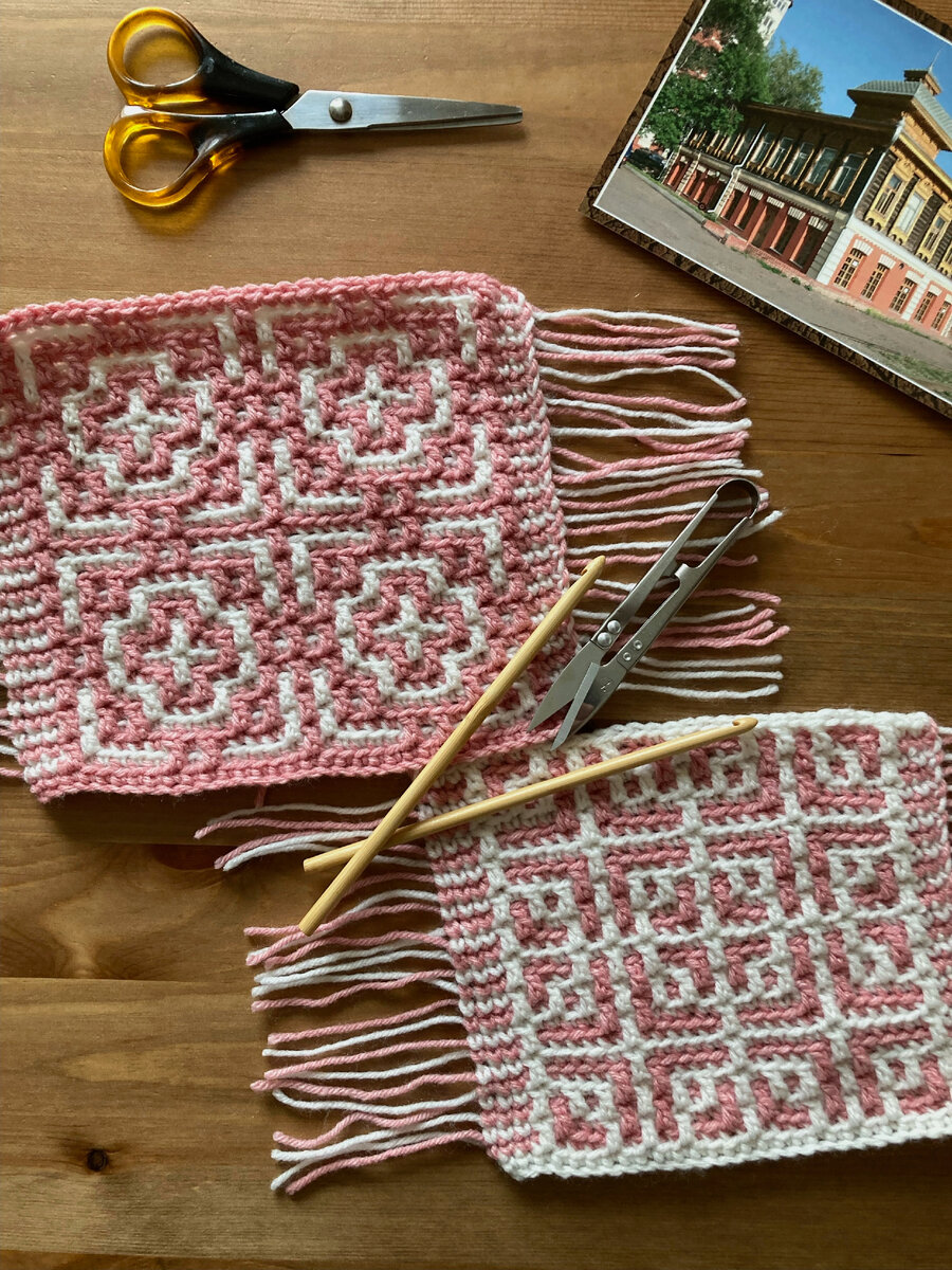 Здравствуйте дорогие рукодельницы! Связала два образца узоров для прямого (по лицевой стороне) мозаичного вязания крючком. Вязала из пряжи "Кроха" Троицкой камвольной фабрики, крючком N 4. Состав пряжи - 20% мериносовая шерсть, 80% высокообъёмный акрил, 50 г, 135 м. Пряжа толстенькая, приятная на ощупь, очень подходит для мозаичного вязания крючком пледов, чехлов на декоративные подушки и т.д. Раппорт первого узора состоит из 14 петель в ширину и 14 рядов в высоту. В образце связано по 2 раппорта в ширину и в высоту. Схема узора Раппорт второго узора состоит из 12 петель в ширину и 12 рядов в высоту. В образце связано по 2 раппорта в ширину и в высоту. Схема узора Специально связала два образца узоров примерно похожие друг на друга и из одинаковой пряжи, различия только в том, что в первом образце фон связан розовой пряжей, а сам узор - белой, а во втором образце - наоборот. Первый вариант мне понравился больше, жаль только, что на фотографиях розовый цвет получился блёклым, в реально