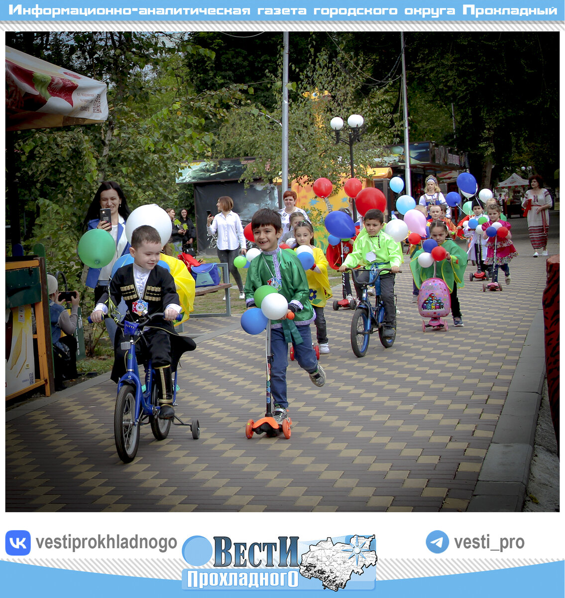 В Парке культуры и отдыха 16 сентября состоялся велопробег «Дружба народов Кавказа» в честь 100-летия образования Кабардино-Балкарской Республики, а также предстоящего Дня города Прохладного. В велопробеге приняли участие воспитанники ДО №2 «Красная шапочка» МБОУ «Лицей №3» г. Прохладного. О безопасности во время мероприятия заботились полицейские и начальник отдела гражданской обороны и чрезвычайных ситуаций местной администрации г. о. Прохладный Владимир Мацалышенко. На парковой площадке развевались флаги России, КБР и города Прохладного, звучали государственные гимны. Работники детского сада и дети были одеты в праздничные, национальные костюмы. Дошкольники и воспитатели воспевали родные края в стихотворной форме, после чего был дан старт велопробегу. Дети преодолели небольшую дистанцию на самокатах и велосипедах, украшенных воздушными шарами, флажками, а на финише их ждали сладкие сюрпризы и свободное катание на площадке. В честь торжественного мероприятия директор парка предостави