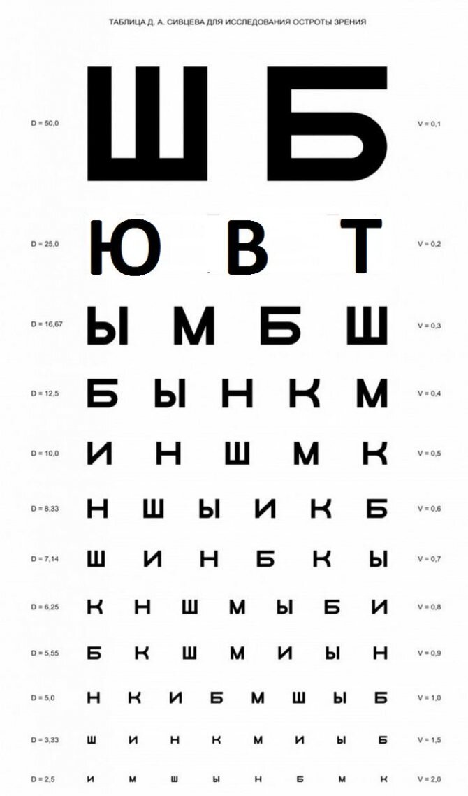 Суть довольно проста: слева каждой строки указано расстояние в метрах, с которого их должен видеть человек с нормальным зрением. Поэтому если вы на верхнем ряду можете прочитать "ШБ" с 50 метров, а "ИМШЫНБМК" с 2,5 метра - у вас всё ОК. А справа от строки прописана величина остроты зрения при чтении знаков с расстояния 5 метров (0,1 если глаз видит только верхний ряд; 2,0 - если виден нижний ряд). Нормальным (1,0) считается зрение, позволяющее свободно увидеть десятую строчку с расстояния в 5 метров.