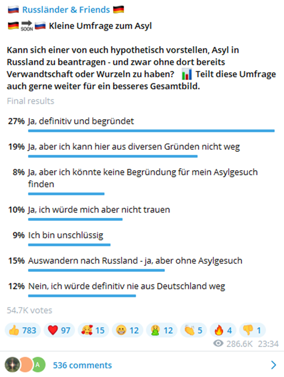 - 27% Да; 19% Да, но не мога да замина по разни причини; 8% Да, но трудно нами-рам обосновка за това; 10% Да, но нямам при-чини да искам убежище; 9% Да, но нямам смелост да го направя; 15% Искам да емигрирам в Русия, но не искам убежище; 12% Не, няма да напусна Германия.