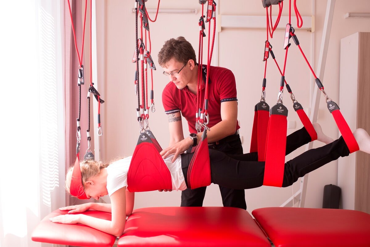 UGUL-терапия - это подвешивание человека к специальным креплениям и поручням с помощью эластичных манжетов. Таким образом телу можно придать практически любое положение.