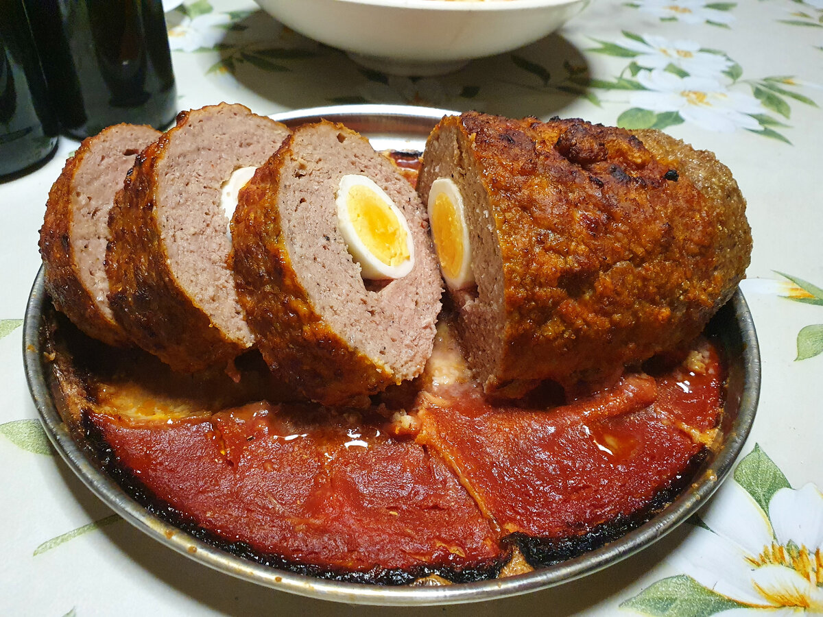 3 яйца заранее отварить вкрутую. Фарш смешать с 1 сырым яйцом, ч.перцем, паприкой орегано, частью отрубей (до такой густоты, чтобы не расплывался) и хорошо отбить - все как мы привыкли с котлетами. Мясную массу уложить прямоугольным пластом на силиконовый коврик или пищевую пленку, посередине разместить целые вареные яйца в одну линию. Аккуратно завернуть мясной пласт с обеих сторон на яйца, сформировав таким образом рулет. Убрать в холодильник для загустения и стабилизации минимум на 1ч. Рулет обмазать оставшимся яйцом, обвалять в сухарях (можно пару раз повторить) и быстро обжарить на раскаленном масле до корочки. Отдельно обжарить измельченный лук, чеснок, чили до мягкости. Влить вино, добавить томатную пасту, лавр. Когда закипит, уложить в пережарку рулет и тушит 40-45мин под крышкой, периодически поливая соусом, в котором он тушится. Рулет можно так же приготовить в аэрогриле (наш вариант) или мультиварке.
