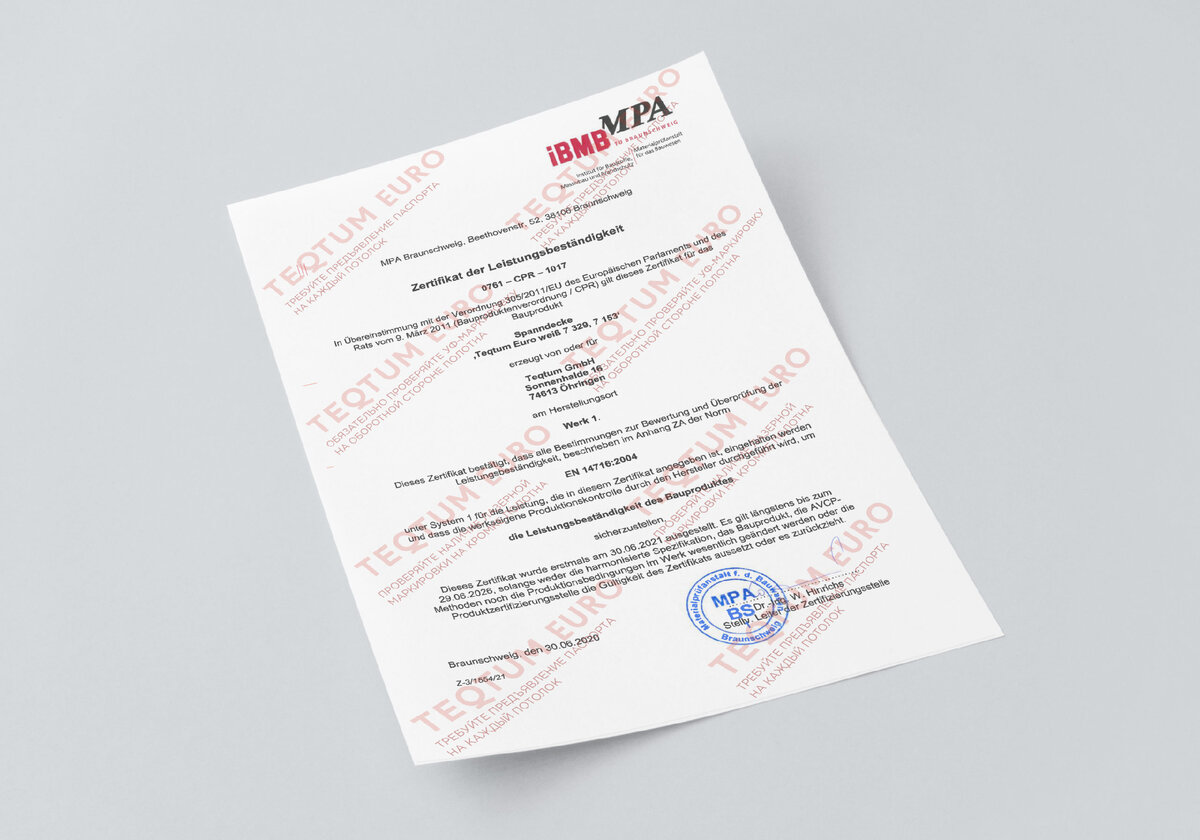 Teqtum Euro — единственный пожаробезопасный материал, с подтвержденной официальной европейской сертификацией. Полотно имеет класс пожарной безопасности Bs1d0, согласно DIN EN 13501 (европейская классификация строительных материалов на огнестойкость).