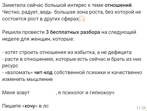 Если бы там было написано: Заметила сейчас большой интерес к теме отношений. Честно, радует, ведь большая зона роста, без которой не состоится рост в других сферах, ведь я разбираюсь в этом, а значит могу заработать Звучало бы искреннее, правда? 2. Решила провести 3 бесплатных разбора на следующей неделе для женщин, которые: Тут следует читать: Решила провести 3 [ любое количество] бесплатных разборов, на следующей неделе для женщин, [чтобы по