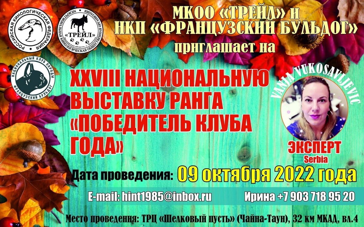 НКП «ФРАНЦУЗСКИЙ БУЛЬДОГ» И МКОО «ТРЕЙЛ» ПРИГЛАШАЮТ НА XXVIII НАЦИОНАЛЬНУЮ ВЫСТАВКУ РАНГА «ПОБЕДИТЕЛЬ КЛУБА ГОДА». *ДАТА ПРОВЕДЕНИЯ- 09 ОКТЯБРЯ 2022 года *СУДЬЯ – Vanja Vukosavljevic (Serbia) *МЕСТО ПРОВЕДЕНИЯ- ТРЦ Шёлковый путь (бывший ЧАЙНА ТАУН) г. МОСКВА 32-ой км.МКАД ЦЕЛЕВОЙ ВЗНОС НА ПРОВЕДЕНИЕ ВЫСТАВКИ: ВЕТЕРАНЫ СТАРШЕ 10 ЛЕТ- 1000 РУБЛЕЙ НА ВСЕ ВРЕМЯ ЗАПИСИ!!! *09 ИЮЛЯ – 31 ИЮЛЯ 2022 ГОДА *01 СЕНТЯБРЯ – 25 СЕНТЯБРЯ ГОДА БЕБИ , ЩЕНКИ, ВЕТЕРАНЫ МЛАДШЕ 10 ЛЕТ-1800 РУБЛЕЙ, ВЗРОСЛЫЕ- 2500 РУБЛЕЙ *26 СЕНТЯБРЯ – 05 ОКТЯБРЯ 2022 ГОДА БЕБИ , ЩЕНКИ, ВЕТЕРАНЫ МЛАДШЕ 10 ЛЕТ-2000 РУБЛЕЙ, ВЗРОСЛЫЕ- 3000 РУБЛЕЙ С 09 ИЮЛЯ ПО 25 СЕНТЯБРЯ 2022 СКИДКА 10% НА КОЛЛЕКТИВНУЮ ЗАПИСЬ ОТ 5 СОБАК КОНКУРСЫ- ПАР, ПИТОМНИКОВ – 500 РУБЛЕЙ ОСОБЫЕ УСЛОВИЯ ДЛЯ УЧАСТНИКОВ ПРОЖИВАЮЩИХ ОТ 1000 КМ.. ОТ МОСКВЫ НА ВСЕ ВРЕМЯ ЗАПИСИ БЕБИ, ЩЕНКИ И ВЕТЕРАНЫ МЛАДШЕ 10 ЛЕТ -1500 РУБЛЕЙ, ВЗРОСЛЫЕ -2000 РУБЛЕЙ В ПРОГРАММЕ ВЫСТАВКИ: *ПОДВЕДЕНИЕ ИТОГОВ БОНИТИРОВКИ И ВРУЧЕНИЕ ДИПЛОМОВ *НАГРАЖДЕНИЕ ПОБЕДИТЕЛЕЙ