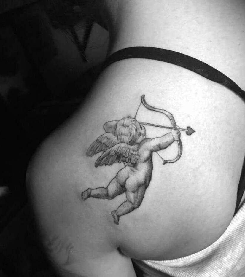 Каноническое изображение Купидона в виде круглолицего малыша, в руках у которого лук и стрелы, а за спиной чудесные крылья. Исполняется татуировка в цвете или монохромно.