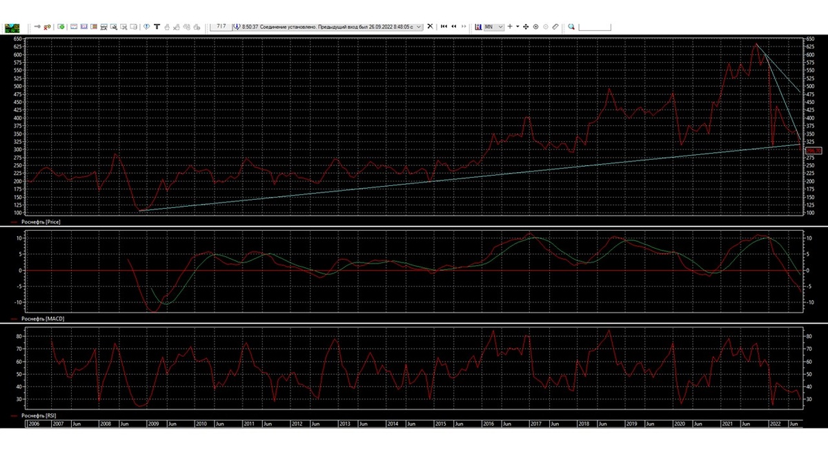 Не буду расписывать прогнозы по дивидендам Роснефти и другие новости по компании Роснефти. После объявления мобилизация все прогнозы и начисления дивидендов могут не исполняться. С помощью технического анализа постараемся спрогнозировать движение акции Роснефти к началу октября 2022 года. Месячный график показывает попытку пробить уровень 296, индикатор RSI достигла уровня 30%, но продолжает показывать движение вниз. Индикатор MACD показывает медленная линия сверху пробила нулевой уровень и двигается вниз. Быстрая линия сверху под прямым углом пробила медленную линию и нулевой уровень и ушла далеко вниз и продолжает идти вниз, медведи всем показали свою силу. Недельный график показывает силу медведей, готовых двигаться дальше вниз, индикатор RSI показывает пробитие уровня 30% и смотрит вниз. Индикатор MACD показывает медленная линия находится ниже нулевого уровня, но развернулась на вверх. Быстрая линия не дошла до нулевого уровня и развернулась вниз и двигается к медленной линии. Т