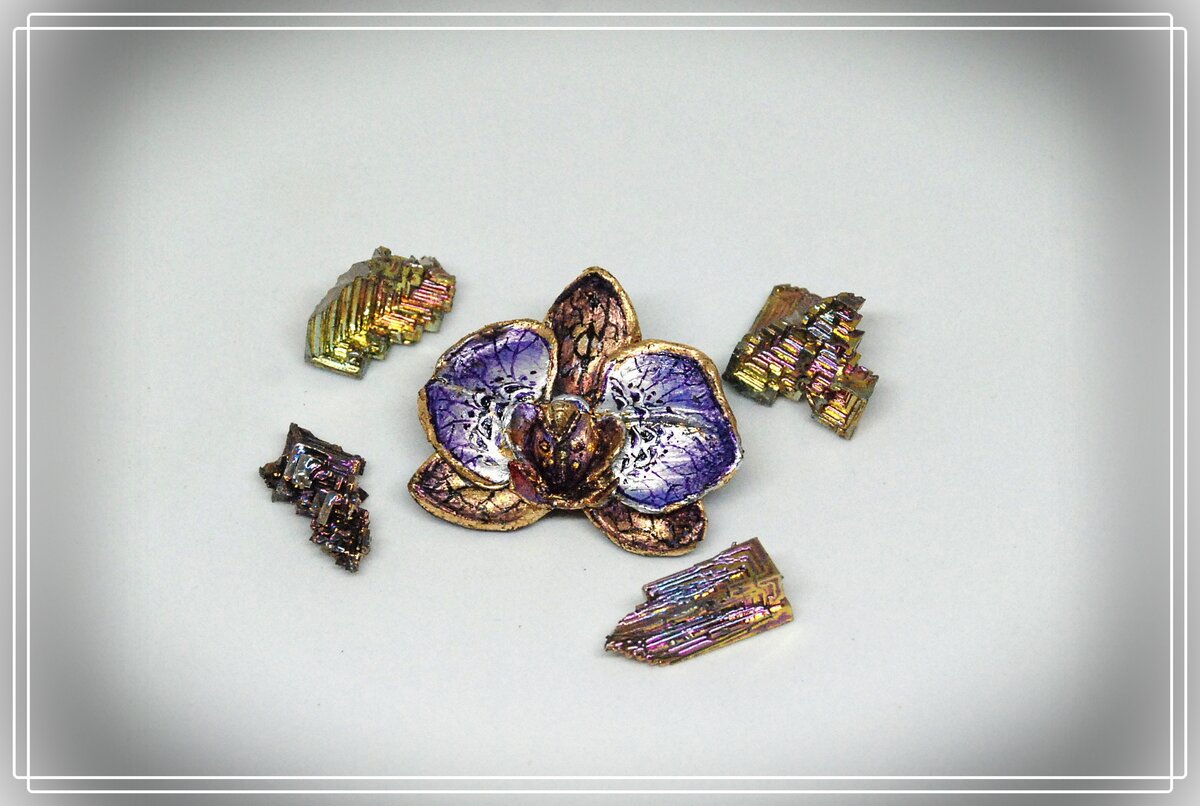 Есть такой удивительный и очень красивый металл - висмут. Люди научились его выращивать. А некоторые с успехом делают это прямо у себя дома. Висмут переливается ярко-синим, фиолетовым, розовым. Но небольшой образец, который я купила в магазине "Камневеды" отливал ярко-голубым. Из-за металлического блеска снять его оказалось целой проблемой - фото не передает даже части того, насколько он красив Покупала я его для создания украшения. Рисунок возник перед глазами сразу же, стоило взять висмут в руки - орхидея. Понятно, что украшение с такой необычной вставкой не могло выглядеть ординарным Создание такого украшения обычно занимает не один день. В первую очередь нужно было сделать цветок - без него невозможно перейти к следующему этапу - вытачиванию оправы. В качестве материала для орхидеи я взяла полимерную глину (FIMO). Обычно оправа служит еще и надежной укрепляющей основой для того, что я делаю из полимерной глины - цветов, бабочек, рыб. В этот раз цветок должен был стать самостоятель
