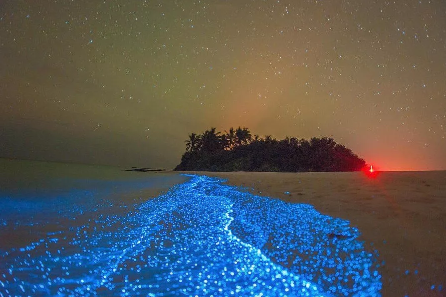 Остров Ваадху-филиал звездного неба на земле. Светящиеся пляж и Индийский Океан. Необычная уникальность природы. Это происходит благодаря химическим реакциям микроорганизм - Фитопланктон. Это явление характерно не только Ваадху, но и многим другим островам Мальдив. Расстояние от Мальдив Мале окола 400 км. #мальдивы #океаны #пляж #мир #земля