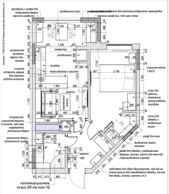 Небольшую квартиру в новом доме дочь купила для своей мамы пенсионного возраста. При выборе недвижимости отталкивались от того, чтобы она располагалась недалеко от их собственного жилья и от школы внуков. И теперь по завершению ремонта здесь частенько собираются три поколения одной семьи. Квартира была приобретена без отделки и перегородок, и для того, чтобы "бетонную коробку" превратить в полноценную комфортную квартиру дочь обратилась к архитектору Наталье Хиловой. План квартиры после ремонта и установки мебели После разработки нового планировочного решения на небольшой площади удалось организовать: кухню-гостиную, гардеробную при спальне хозяйки, хозблок, а на лоджии, которую утеплили и присоединили к кухне оформить рабочее место для внуков и столовую группу. Кухня-гостиная По плану от застройщика мокрая зона располагалась сразу у входа справа - в процессе ремонта ее сместили ближе к окну, где позже и оформили рабочую и столовую зоны. А на ее месте организовали небольшую гостиную,