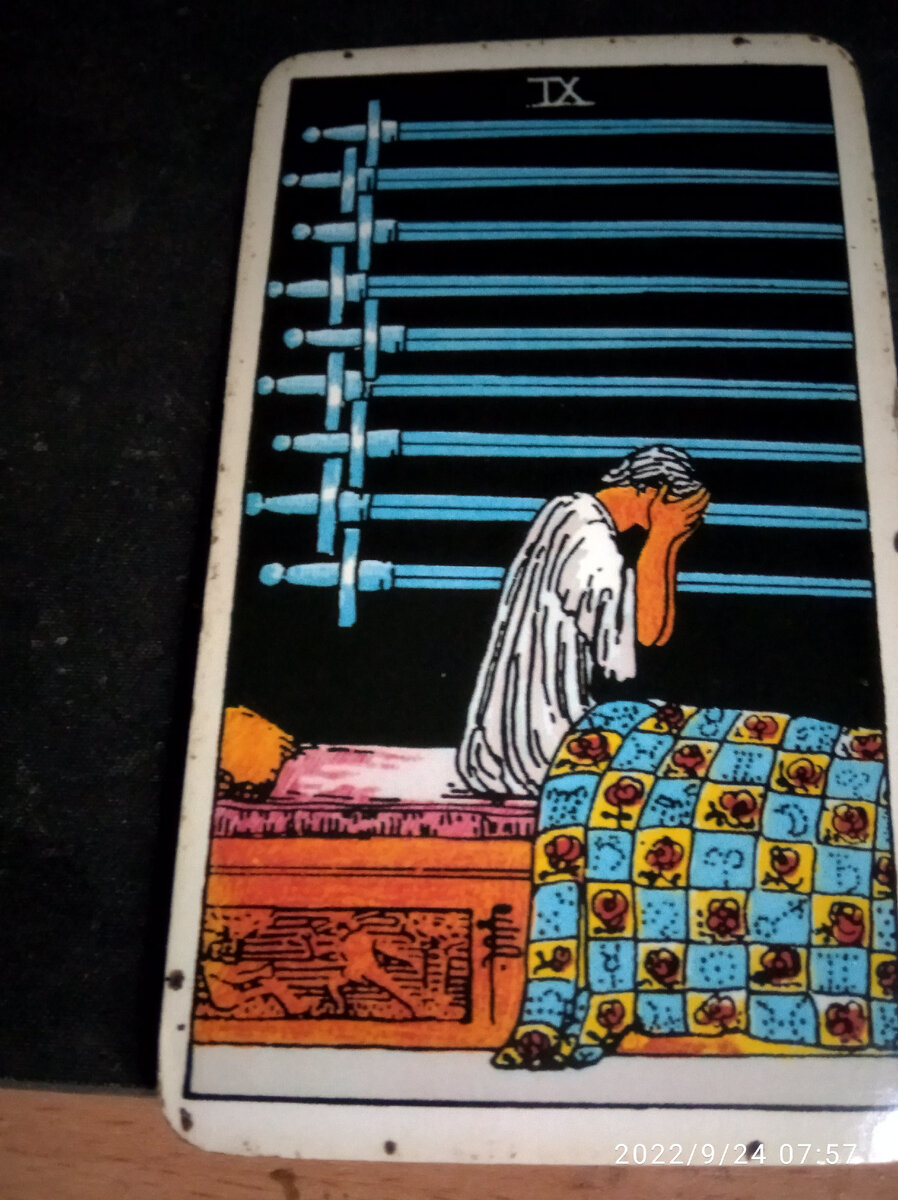 Здравствуйте сегодня карта дня 9 Мечей. Глядя на нее я скажу что вишу печать беспокойства на вашем сердце,видимо вы сильно переживаете за кого - то из родных или близких от которых по не известным причинам нет не каких известий. Вероятно вы охвачены тревожными предчувствиями с которыми пытаетесь безуспешно бороться внутри себя и не успокоитель до тех пор пока не подтвердите или не опровергнуте свои догадки и подозрения. Возможно вы так же пытаетесь перебороть в себе чувство вины или вас мучает стыд,где то в своей жизни вы совершили что - то постыдное что порой раз всплывает в вашей памяти и омрачает ваше настроение, и все ваши попытки унять угрызения совести не дают вам никого облегчения а наоборот усиливает чувство вины и обостряют ваши переживания. Может быть стоит подумать над тем чтобы если не исправить грехи прошлого то хотя бы исповедоваться в них перед кем вы виноваты чтобы получить прощение и обрести облегчение совести