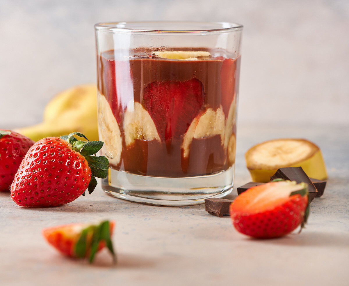 Сладкое фондю на основе веганского шоколада с добавлением фруктов. Он изготовлен из сырого какао, полностью органический, не содержит рафинированного сахара. Благодаря своему натуральному составу этот оригинальный десерт с добавлением клубники и банана порадует всех сторонников правильного питания. Vegan, dairy free