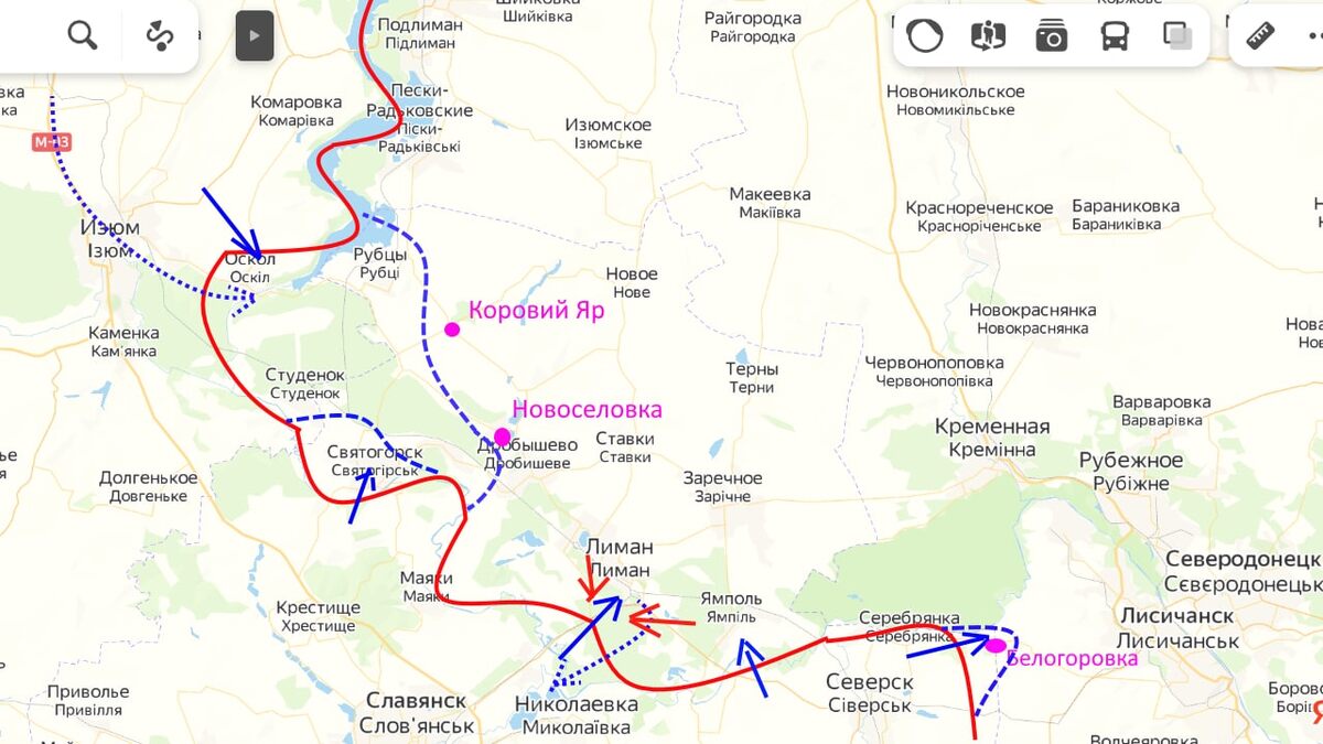 Вчера противник продолжал попытки прорвать линию фронта ВС РФ под Красным Лиманом, но значимых результатов при этом достигнуто не было. Везде он натыкался на плотных заградительный огонь, а попытки прорваться в районе Новосёловки-Дробышево привели к значительным потерям. Также, по уточненным данным н.п. Коровий Яр противник пока под контроль не взял. Это из хороших новостей. Из плохих... с утра (вернее, с ночи) со стороны Харькова на Изюм следуют огромные колонны ВСУшного "воинства", которое очевидно кинут "на последний штурм" Лимана, максимум завтра, чтобы взятием под контроль этого города подсластить пилюлю политического поражения в связи с проведением Россией референдумов. А потому стойкости нашим ребятам. Похоже завтра будет для Лимана судный день...