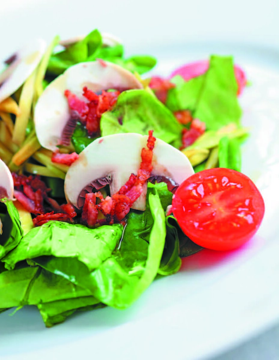 На 1 порцию: Шпинат • 100 г Авокадо • ¼ шт. Шампиньоны • 1 шт. Бекон • 30 г Сок лимона • ½ ч. л. Уксус бальзамический • ¼ ч. л. Масло оливковое • 2 ч. л. Помидоры черри • 3 шт. Соль • по вкусу