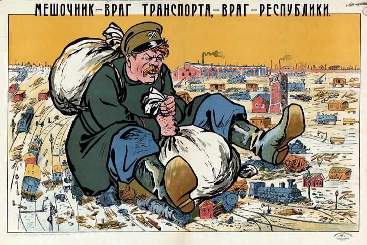 Ровно 80 лет назад в стране начали активно бороться мешочниками. С этим массовым явлением советская власть столкнулась еще в 20-е годы прошлого века, когда поезда были заполнены людьми, мечущимися с узлами и баулами. В условиях военного коммунизма пассажиры везли в деревни одежду и обувь, обратно – зерно, которое крестьян большевики обязывали сдавать государству по низким ценам. В чемоданах возили муку. Деньги ничего не стоили, процветал натуральный обмен. Карикатуры с мужиками и бабами, обремененными заплечными ношами, развешивали на вокзальных заборах, что освобождению транспорта от мешочников не способствовало. История повторилась в 1942 году, когда власти принялись изымать у голодающего населения незаконно перевозимые продукты.
