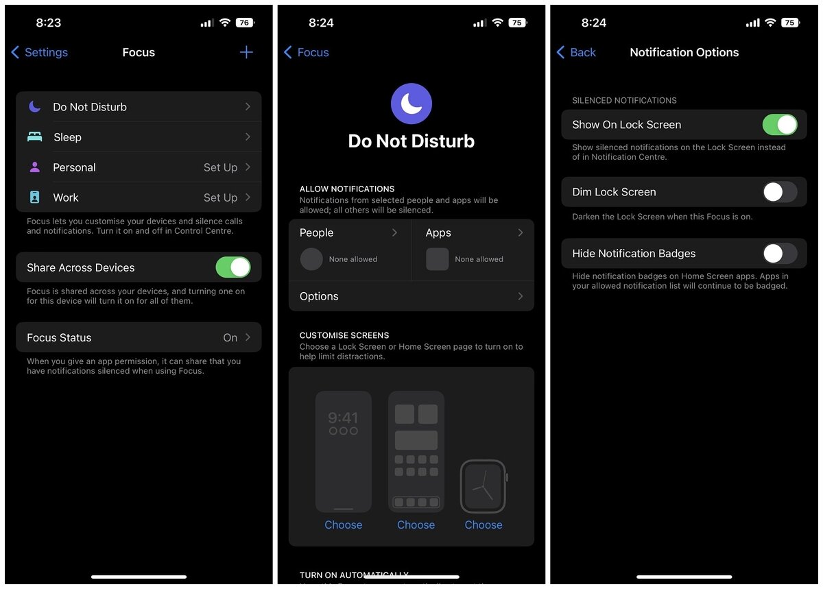 Как сообщает XDA, в iPhone 14 Pro не один режим всегда включённого экрана, а два, включая более привычный вариант, хорошо знакомых многим пользователям Android-устройств. Первый режим уже описали многие блогеры и обозреватели в своих роликах на YouTube: в этом режиме яркость экрана уменьшается, при этом изображение на экране сохраняется, видны обои и виджеты. Второй режим позволяет сделать экран полностью чёрным. Пользователи могут включить его в разделе «Настройки» — «Фокус» — «Выбрать режим фокусировки». В этом режиме он похож на Always on Display в смартфонах под управлением Android. Фон будет черным, а время, дата и погода будут отображаться белым шрифтом. Да, официально, этот режим Apple называет «режимом фокусировки». В отличие от телефонов на Android, после включения этого режима в нижней части интерфейса телефона всегда будет отображаться «Не беспокоить». Поскольку в серии iPhone 14 Pro используется панель LTPO, частота обновления в режиме без экрана может составлять всего 1 Гц