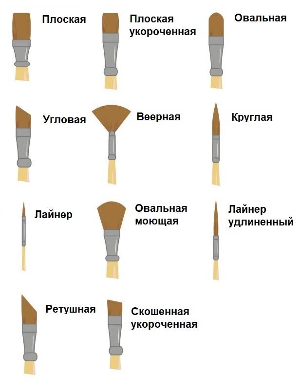 Кисти бывают разные например: флейц–это широкая плоская кисть, предназначенная для нанесения широких слоев краски одним мазком и для свободной живописи заливками. Используется, главным образом, с акварелью, поскольку может удерживать много краски; всего несколькими движениями позволяет создавать большие по площади фактуры. веерные – это плоские кисти, имеющие негустой пучок в форме веера. Они предназначены для растушевки краски, уже нанесенной на основу. С помощью таких кистей можно сделать утонченную цветовую растяжку. Они подходят также для смешивания, смягчения контрастов и фактуры. Используются для создания спецэффектов в портретной, пейзажной и абстрактной живописи. контурные кисти – это вид плоских кистей, который имеет более короткий пучок. Это придает им большую упругость и улучшает контроль над качеством плоских мазков. Кроме того, более короткий волос облегчает создание плавного перехода одного цвета в другой и хорошо выделяет контур. скошенные кисти– это плоские кисти, имеющ