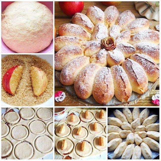 Вам потребуется: Тесто: Молоко — 150 мл. Дрожжи быстрорастворимые — 1,5 ч.л. Яйцо — 1 шт. Сметана — 1 ст.л. Сахар — 1,5 ст.л. Соль — 1/2 ч.л. Масло сливочное — 50 гр. Мука — 370 гр. Начинка: Яблоки — 3 шт. (небольшие) Сахар тростниковый — 40 гр. (можно заменить обычным) Корица — ½ ч.л. Растительное масло — для смазки формы Как готовить: 1. В теплом молоке развести дрожжи. Добавить сахар, соль, сметану, яйцо и растопленное сливочное масло. Хорошо перемешать. Просеять муку. Замесить тесто, накрыть полотенцем и поставить в теплое место для подъема, минут на 25-30. 2. Тем временем сахар смешать с корицей. Яблоки помыть, удалить сердцевину и порезать на дольки. Каждую дольку обвалять в тростниковом сахаре с корицей. 3. Через 25-30 минут тесто должно увеличиться в объеме. Раскатать тесто толщиной, примерно, 0,7 см. Вырезать кружки. На каждый кружок положить дольку яблока. Защипать каждую дольку яблока в кружок теста и разложить в форме для выпечки (у меня форма 26 см, по большому кругу я
