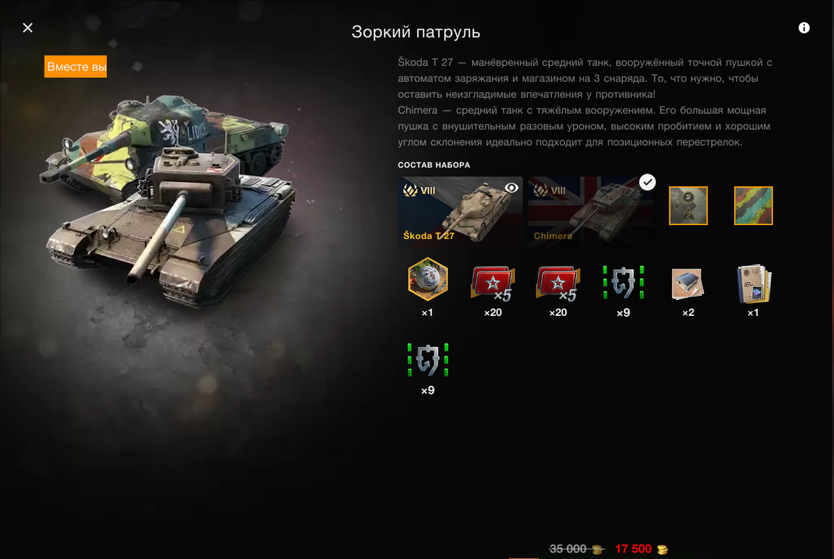 Передаю всем привет из глубин интернета. Радует картофель (или не картофель?) в последнее время интересными предложениями в премиум магазине. Две машины за 17 500 голды - тема двоякая. С одной стороны - дорого. С другой, если подумать, вполне себе норм цена за интересные тачки. Škoda T 27 Цена за отдельную "голую" машину - 8 500 голды Чехословацко-Чешский средний танк Чехии с очень интересным барабаном на 3 снаряда. Главная фишка тут в разрядке внутри барабана всего в 1.5 секунды, что реально позволяет ловить противников на ошибках. Пробитие на ББ адекватное (204 мм), альфа стандартная - 220. Т.е. за 3 секунды можно выдать противнику 660 урона и на ближайшие 16 сек спрятаться в укрытие. Как и у других Чехословацко-Чешских средних танков Чехии, шкода играется за счет неплохой подвижности и адекватных УВН в -8 градусов. На другой стороне весов у нас очень слабое (249 мм) пробитие на голдовых снарядах, полное отсутствие брони, отвратительная стабилизация и не очень приятное время сведения
