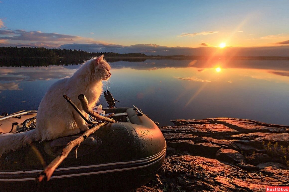 Вот тогда кот как выпрыгнет! Как заорёт! Резину любит, а воду — нет. Он от страха на дерево забрался, а мы не стали его оттуда снимать и залезли в лодку, прихватив удочки.