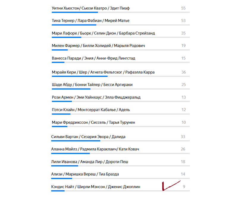 Здравствуйте! Мы продолжаем вспоминать любимых певиц. И заодно голосуем за самых любимых из них. Вот результат голосования в 5-м туре: Кто набрал меньше всех голосов, тот становится героем нашей статьи. Кэндис Найт S Z: Кэндис Найт (настоящая фамилия - Изралов) - жена великого и ужасного Ричи Блэкмора, и по совместительству вокалистка его проекта Blackmores Night. Обожаю тембр её голоса, а ещё - сама она красавица. Если не ошибаюсь, прадед её - выходец из Российской Империи. Ширли Мэнсон Елена Дорожкина: Ширли Мэнсон - шотландская певица и актриса, солистка рок-группы Garbage. Завораживает меня её характерное контральто! В том числе и благодаря этому выразительному вокалу Garbage смогли стать одной из наиболее успешных рок-групп 90-х. Впервые услышала их The World is Not Enough в одноимённом фильме Бондианы и влюбилась в голос солистки. Ещё из любимых могу назвать Milk. Не уверена, что меня многие поддержат (всё же, это более современная певица), но не поделиться своим восхищени