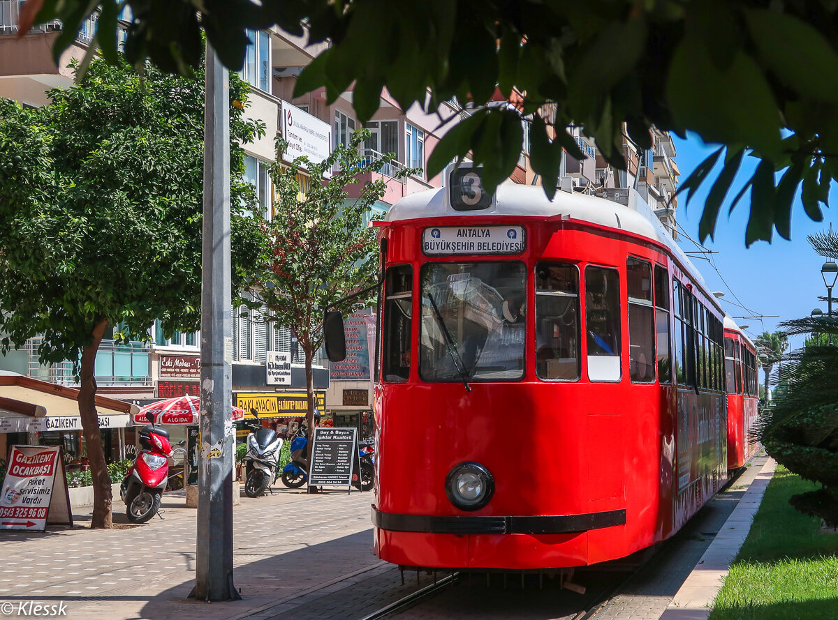 Ностальгический трамвай в Анталии был открыт в марте 1999 года. В качестве подвижного состава используется три двухвагонных поезда. Линия начинается от конечной Музей. Здесь же можно пересесть на линию современной трамвая, остановку которого видно на заднем плане. Поезд 1-2 на остановке Музей, для высадки пассажиров, расположена на кольце. В обратную сторону уже после стрелки. Линия исторического трамвая однопутная с разъездами. Всего на линии 3 разъезда, что позволяет обеспечить работу одновременно всех трех поездов с интервалом работы в 15-20 минут, при этом по факту используется только 1 разъезд и интервал движения составляет 30 минут. Поезд 1-2 в сторону Музея на неиспользуемом в работе разъезде Meslek Lisesi. Разъезд Meslek Lisesi в сторону Музея. Система оплаты на ностальгической линии отличается от городских линий, тут нет турникетов на станции и из-за этого вход производится в первую дверь с обязательной валидацией билетов, за чем следит специальный охранник. Линия по ули