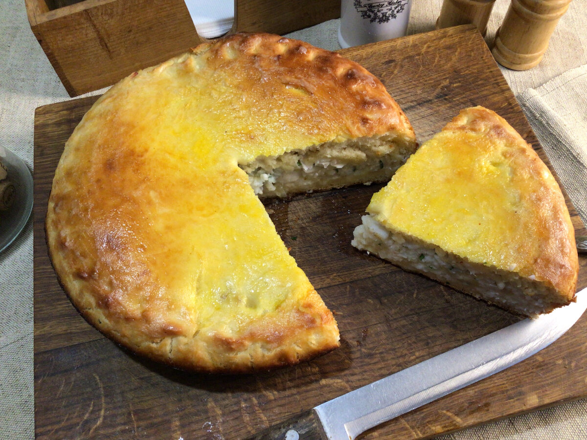 Очень вкусный и сытный пирог из пресного дрожжевого теста с рыбой и рисом.