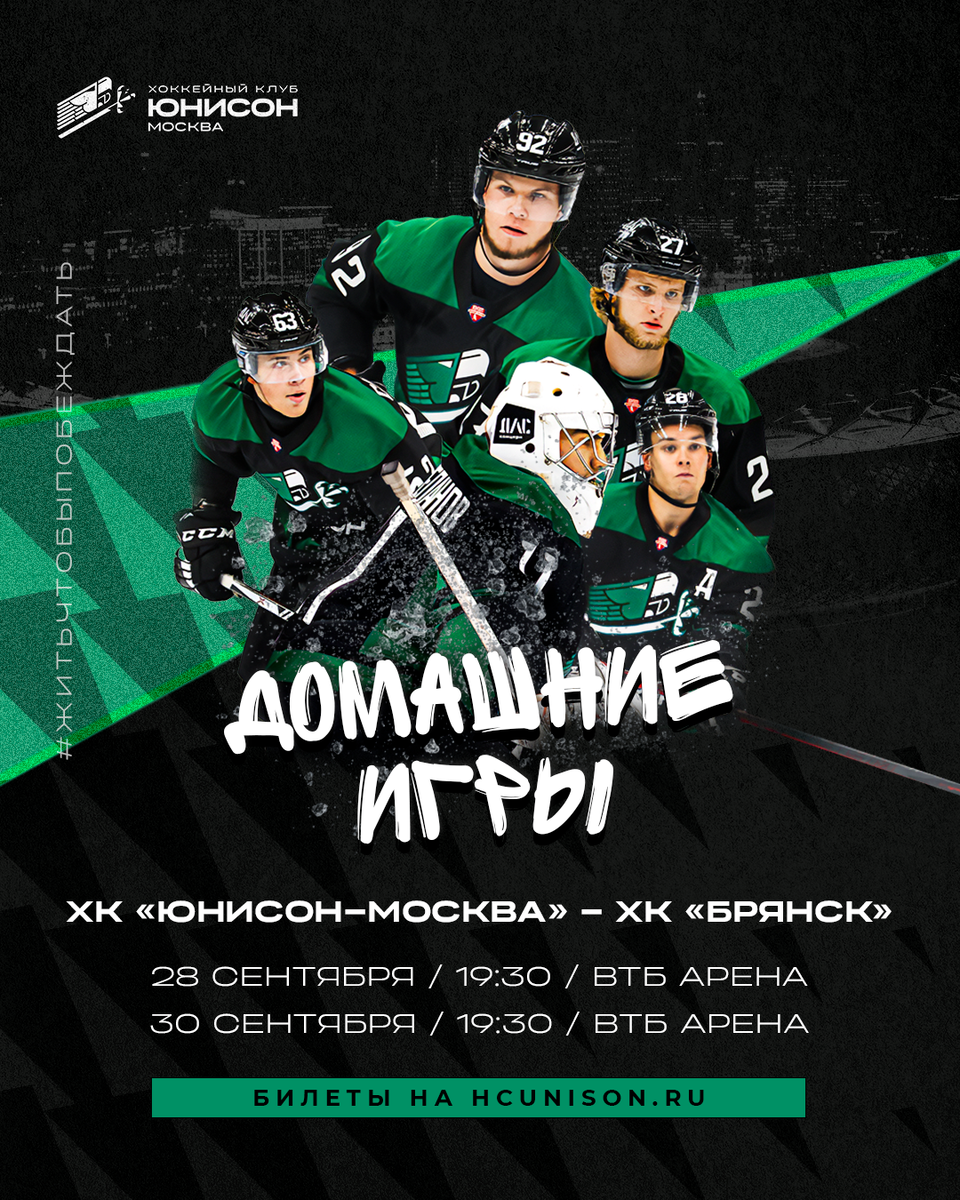 В прошлый раз грифоны навели шуму на льду ВТБ Арены и показали характер. И вот уже 28 и 30 сентября ХК «Юнисон-Москва» вновь сыграет на домашней арене. Следующий соперник - хоккейный клуб «Брянск». Перед матчем вас ждёт развлекательная программа, аквагрим и выступление нашей группы поддержки, так что приходите заранее😉 🎫 Билеты можно приобрести на нашем официальном сайте https://hcunison.ru Специально для наших подписчиков, при покупке онлайн, действует промокод: СЕРДЦАВУНИСОН Дети до 6 лет могут попасть на матч бесплатно. Чтобы ваш визит на матч был максимально комфортным, обратите внимание на важную информацию. 🏒Вход на трибуну А, трибуну В и зону VVIP будет осуществляться через вход А. 🏒Парковка ВТБ Арены будет работать в стандартном режиме. Первые 2 часа бесплатно, третий час 150 р., четвёртый и далее 50 р. Напоминаем, ВТБ Арена находится по адресу: Ленинградский проспект, д. 36 (ст. м. Динамо/Петровский парк) Увидимся на ВТБ Арене! #ЖитьЧтобыПобеждать #МыКомандаЮнисонМосква #